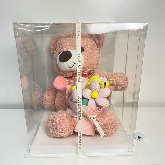Růžový Plyšový Medvěd s Kyticí 30cm v Průhledném Boxu
