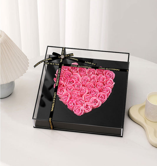 34 Růžových mýdlových růží v Srdcovém Dárkovém Boxu 29 x 29 cm