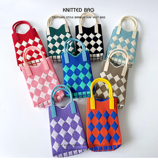 Korean Panda Bliss Knit Tote Patchwork diamant tmavě zelená